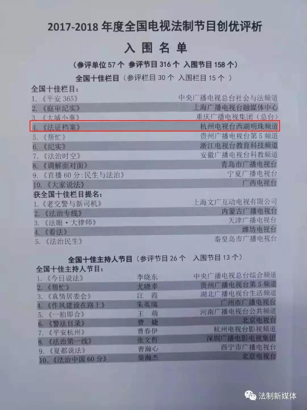 汉博《法证档案》喜获2017-2018年度全国电视法制节目创优全国十佳栏目
