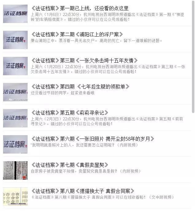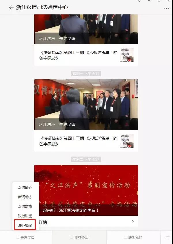 2、点击微信下方栏目走进汉博--法证档案即可回看往期节目
